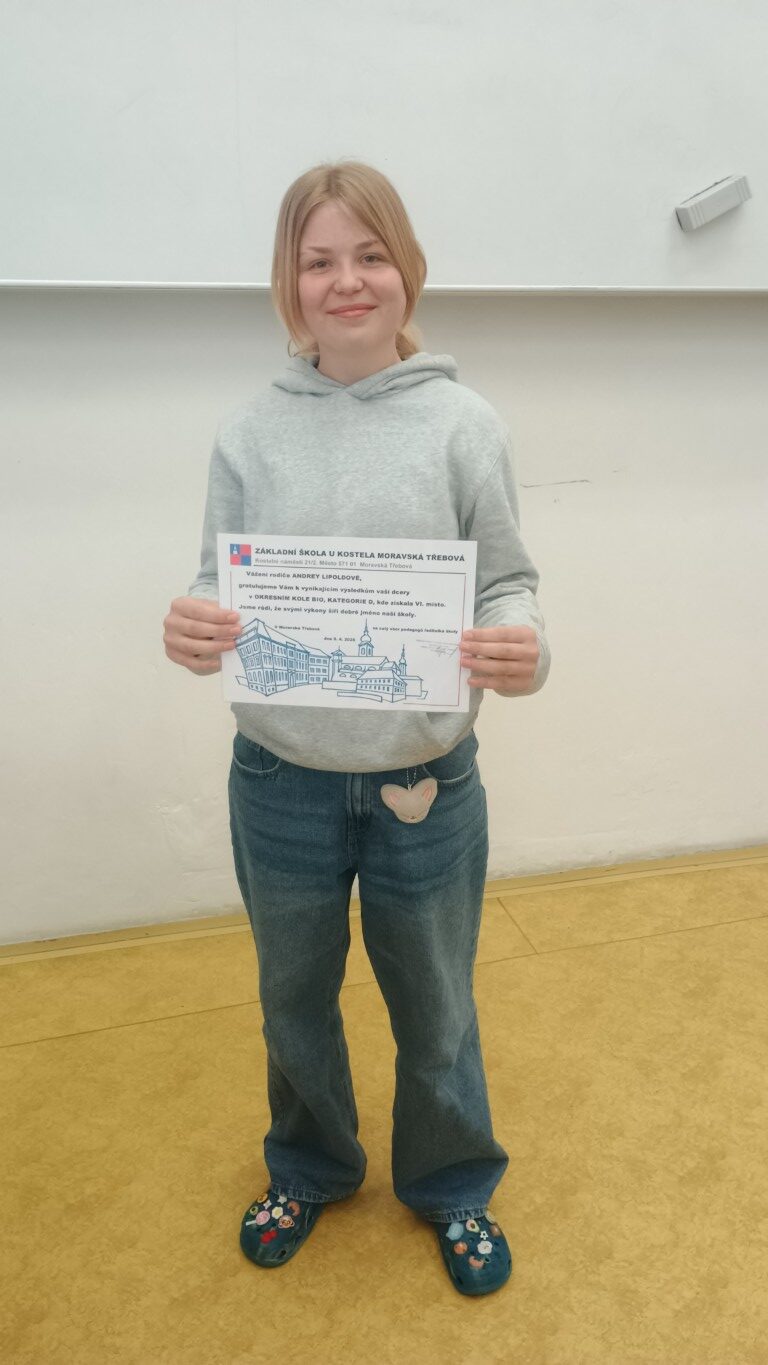 Andreu Lipoldovou, žákyni třídy 7.A, příroda zajímá a téma letošního ročníku Tajemný život lesů“, jí bylo blízké. Studijní text byl zaměřen na ekologii lesních ekosystémů na Zemi, interakce organismů v lese, lesní půdu a poznávání rostlin, hub a živočichů vázaných na toto prostředí. Seznam organismů pro teoretickou soutěž stejně jako seznam organismů doporučených pro praktickou část soutěže byly pro Anďu výzvou. Ve školním kole se stala úspěšnou řešitelkou. Pro postup do okresního kola si musela vybrat ze 4 zadaných úkolů. Vybrala si úkol č. 4: Invazní rostliny. Dne 9.4. 2026 se utkalo 27 soutežících z našeho okresu na Gymnáziu, OA a JŠ Svitavy. Zde Anďa podala velmi pěkný výkon. Obsadila 6. místo a stala se jednou ze 7 úspěšných řešitelů soutěže. K úspěchu gratulujeme a děkujeme za šíření dobrého jména školy.